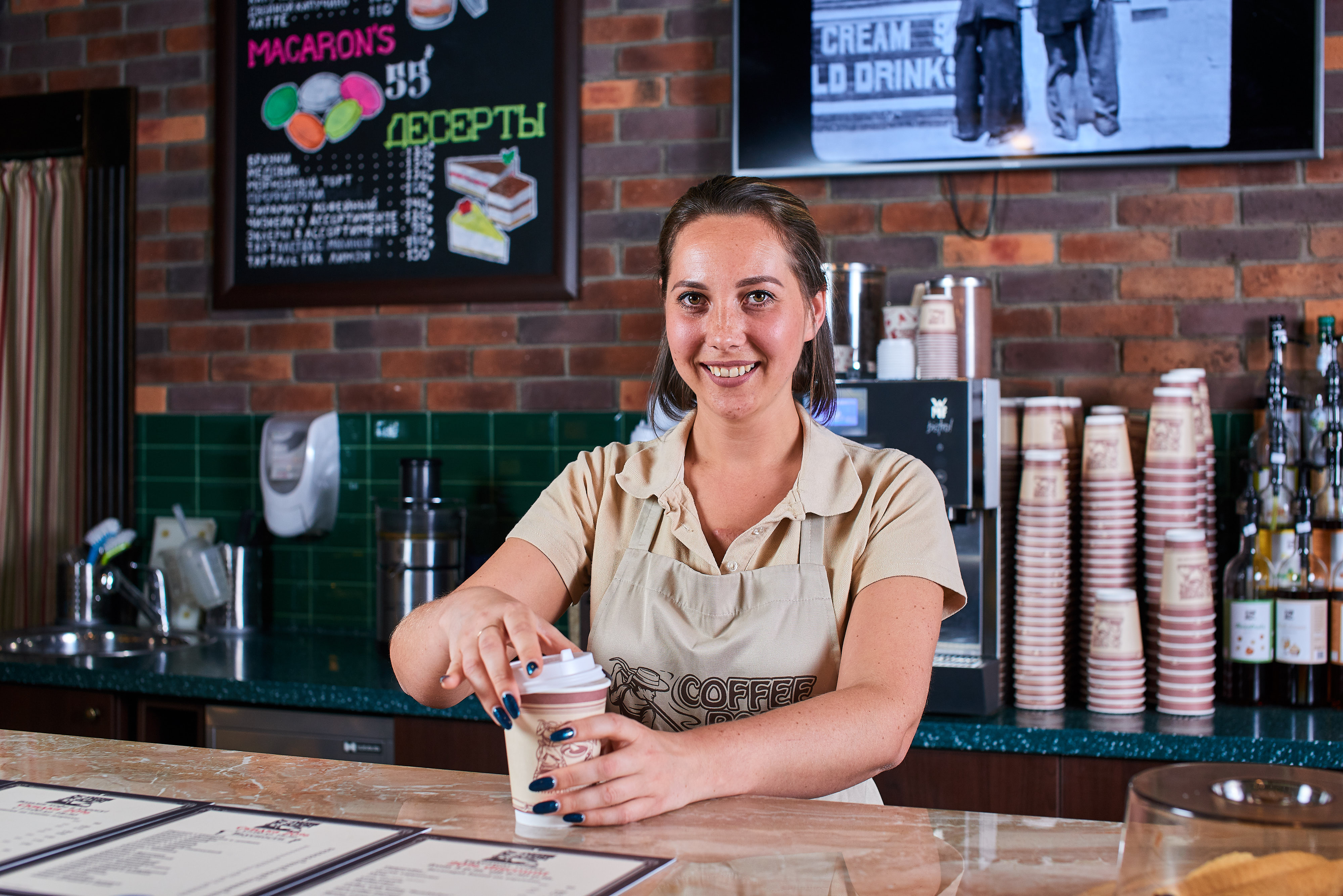 Сотрудники наших кофеен — это милые девушки, выполняющие очень ответственную работу. Ведь на этапе обслуживания к вкусу и качеству добавляется такой немаловажный показатель, как скорость. Мы понимаем, что наши гости ценят нас за наш стабильно быстрый и дружелюбный сервис, поэтому наши сотрудницы работают в режиме многозадачности: готовят кофе, помогают сориентироваться в меню, своим вниманием и улыбкой создают хорошее настроение, задавая правильный тон даже самому напряженному рабочему дню.